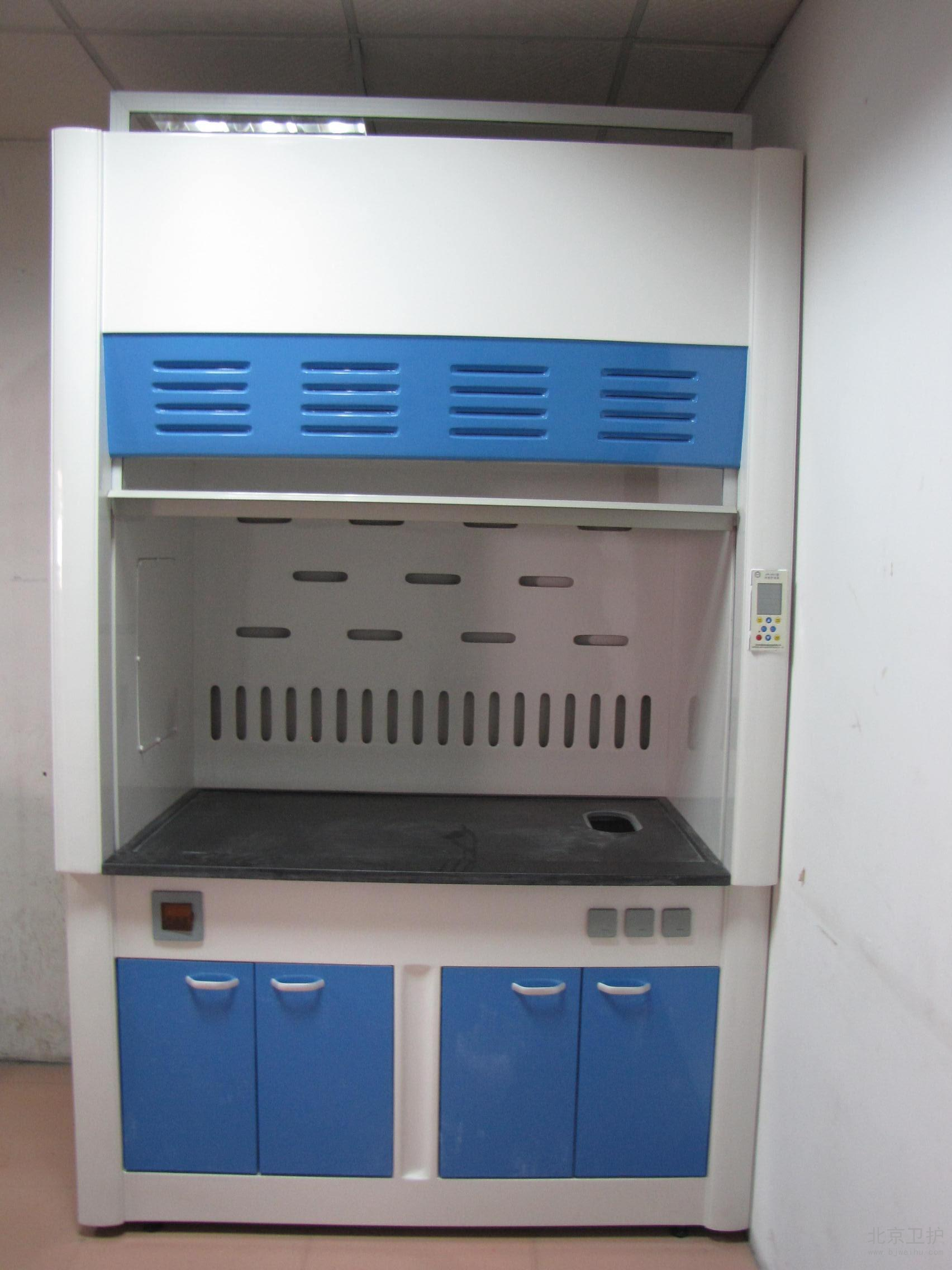 通風(fēng)柜是實(shí)驗(yàn)室家具中必不可少的一種。在實(shí)驗(yàn)室中起到排風(fēng)和換氣的功效。通風(fēng)柜的結(jié)構(gòu)是上下式,其頂部有排氣孔,可安裝風(fēng)機(jī)。上柜中有導(dǎo)流板,電路控制觸摸開關(guān),電源插座等 ,透視窗采用鋼化玻璃,可左右或上下移動(dòng)。供人操作。下柜采用實(shí)驗(yàn)邊臺(tái)樣式,上面有臺(tái)面,下面是柜體。臺(tái)面可安裝小水杯和龍頭。通風(fēng)柜的材料由多種的,全鋼、鋼木、全木、鋁木、塑鋼、PVC結(jié)構(gòu)等,其臺(tái)面是直接與操作者接觸的地方,由實(shí)芯理化板,不銹鋼板,PVC,陶瓷等材料組成。舊式通風(fēng)柜多用木材制成,但現(xiàn)代多為涂有環(huán)氧樹脂的鋼材制造。常見柜寬為1000、1200、1500、1800和2000毫米幾個(gè)規(guī)格,深700-900毫米,高1900-2400毫米。可供1-3個(gè)人同時(shí)使用。 通風(fēng)柜一般靠墻安裝。前方中間為可上下移動(dòng)的透明門(多為玻璃),開啟高度一般為100-600毫米。門后為實(shí)驗(yàn)進(jìn)行的工作面,有水管、下水道、電源、真空泵、氣路管線等實(shí)驗(yàn)需要的連接,上有帶保護(hù)罩的燈照明。空氣由柜內(nèi)前上方的排風(fēng)扇抽走后,或經(jīng)管道引到別處(稱為全通風(fēng)),或經(jīng)過濾重新循環(huán)使用(成為無管通風(fēng))。多數(shù)通風(fēng)柜在(1)排氣量過小(2)前方玻璃門開啟過大的時(shí)候會(huì)發(fā)出警報(bào),提醒操作者注意,一般玻璃門開啟后操作口風(fēng)速不應(yīng)低于0.5m/s,內(nèi)部的排風(fēng)扇速度和燈都有開關(guān)可調(diào)。使用的時(shí)候人站或坐于柜前,將玻璃門盡量放低,手通過門下伸進(jìn)柜內(nèi)進(jìn)行實(shí)驗(yàn)。由于排風(fēng)扇通過開啟的門向內(nèi)抽氣,在正常情況下有害氣體不會(huì)大量溢出。